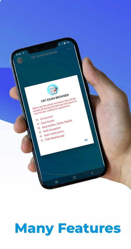 The app supports a custom user agent, only permitting exam access from devices running CBT Exam Browser. This prevents unauthorized logins and ensures that only verified devices can participate in the exam, heightening overall test security.